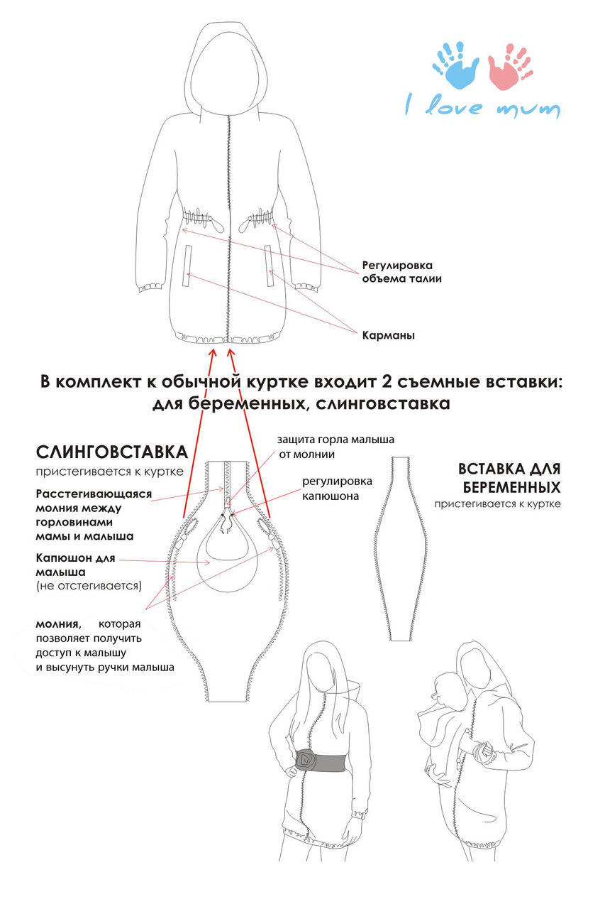 В комплект куртки входят 2 вставки: слинго-вставка, а также вставка для беременных.