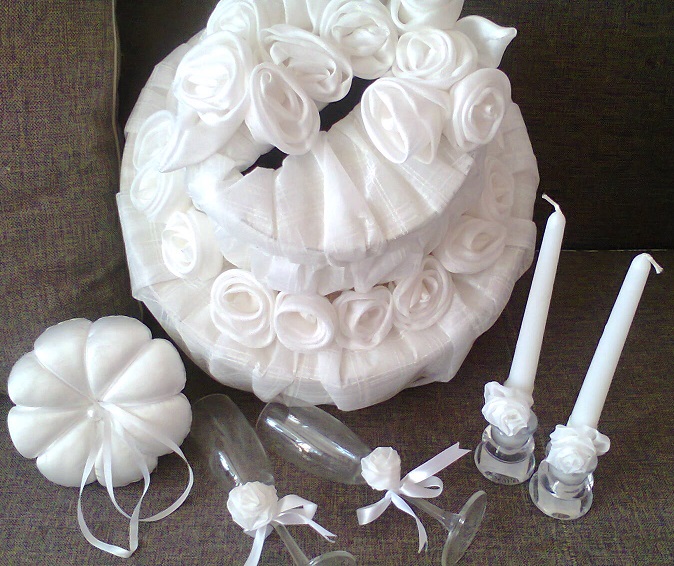 + бокалы для шампанского-2 шт + подсвечники-2шт. + 2 свечи + подушечка для колец (диаметр 15 см, высота 6см).