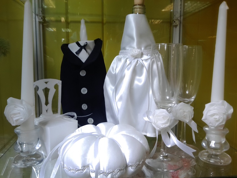 Бокалы для шампанского-2 шт. + «Очаг» свечи – 2 шт. + подсвечники- 2 шт. + подушечка для колец (диаметр 15 см, высота 6 см) ).+ бонбоньерки для гостей «Стульчик» – 25 шт.
