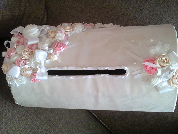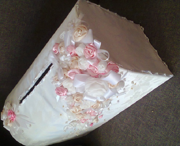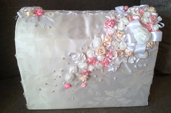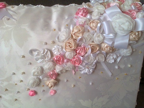 МАТЕРИАЛ: картон толстый, дизайнерская бумага «твид», наполнитель, креп-сатин, лента атласная (3-х видов), тесьма капроновая, креп-атлас (кремовый, розовый, белый для цветов ручной работы); бусины (3 вида).