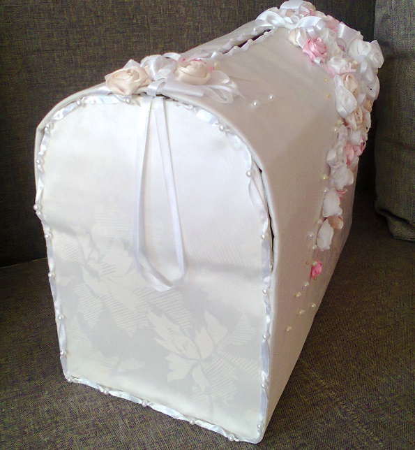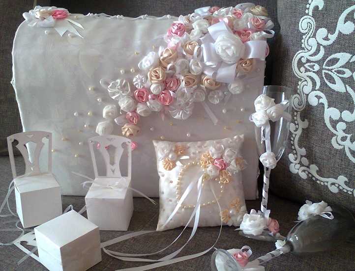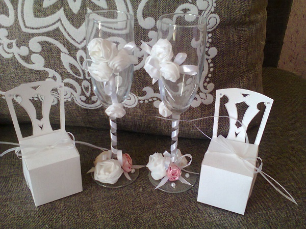 Казна «ларец», открывание боковое ½ стенки; высота 30 см, глубина 22 см, ширина 30 см + бонбоньерки для гостей «стульчик» - 21 шт. + подушечка для колец (14 см х 14 см) + бокалы для шампанского – 2 шт (высота 20 см).