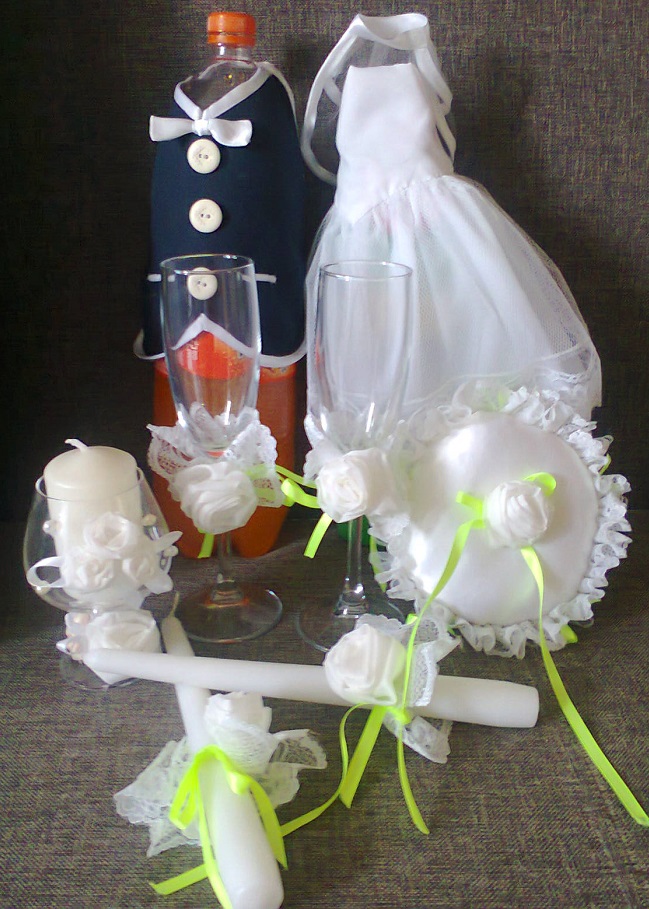 свадебный наряд для шампанского (2 «невеста+жених»).+ «Очаг» свечи – 3 шт + 2 шт. бокала для шампанского